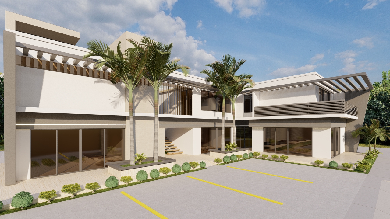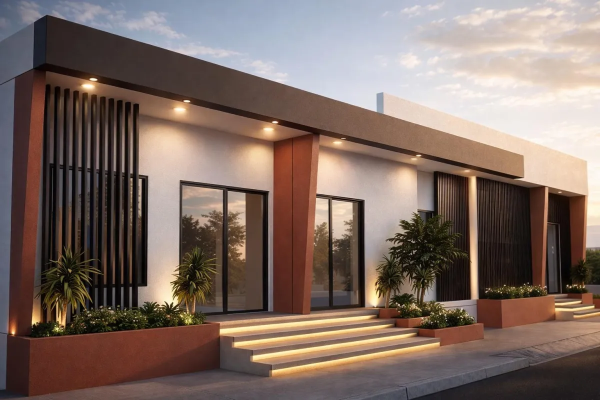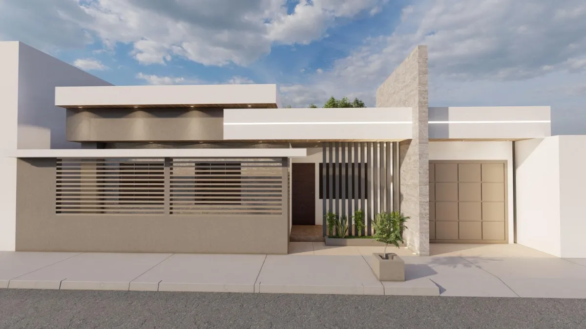 Diseño moderno de una sola planta que combina elegancia y funcionalidad, integrando de forma armónica el área habitacional con espacios comerciales al frente. Las líneas limpias, la iluminación arquitectónica y los detalles verticales aportan presencia y carácter, mientras que las jardineras y materiales cálidos generan una imagen profesional, atractiva y de alto impacto visual para clientes y usuarios.