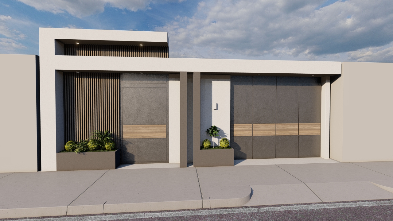 El proyecto destaca por su acceso completamente cerrado, jardineras elevadas que integran vegetación natural y una cubierta en “L” que enmarca la fachada con un diseño contemporáneo. Los portones con detalles en madera y la iluminación arquitectónica realzan los volúmenes, logrando una imagen sobria, moderna y de alto impacto visual.